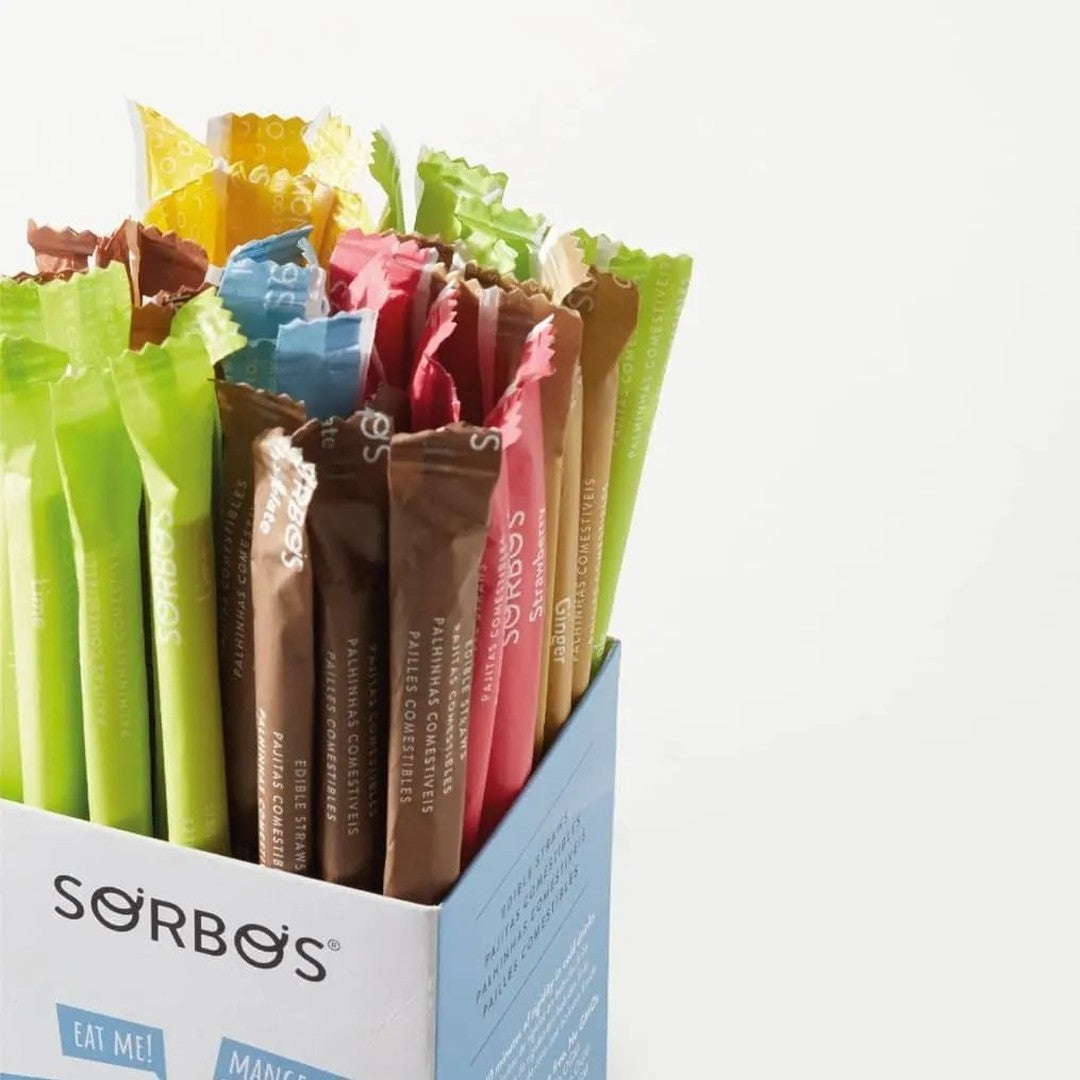 Ovocná brčka Sorbos jsou vyrobena z cukru a kukuřičného škrobu, díky čemuž jsou 100% biologicky ekologická, jsou zcela jedlá a bez lepku. Jednotlivě zabalené z hygienických důvodů mohou tato jedlá brčka vydržet až 40 minut v drinku, což vám poskytne dostatek času na vychutnání svého oblíbeného nápoje.